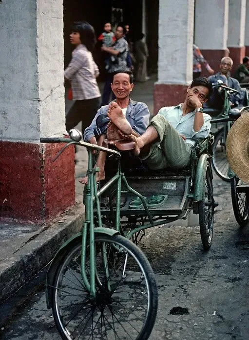 座上的人力车夫有的光着脚、有的戴手表,摊开手臂靠在座椅上,有说有笑,吸口气抬头望天,这点小憩,撑一天拉客的劲就全回来了,这车现在城里可不多见了,老广常说“那会儿的人脚力就是好”。