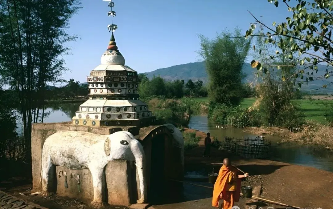 图中这个塔,说大不大,说小不小,地基上直接修成刚好能绕一圈的样式,白墙上抹着泥巴和贝壳,象首护基,塔尖撑天,塔旁边的和尚像是刚打完水回来,手里铁桶还在晃荡,小时候奶奶拉我过去拜过这种小塔,说水流边的庙最灵,也最能守平安,下边的河水一年四季都没断过,塔就是这一块人的主心骨。
