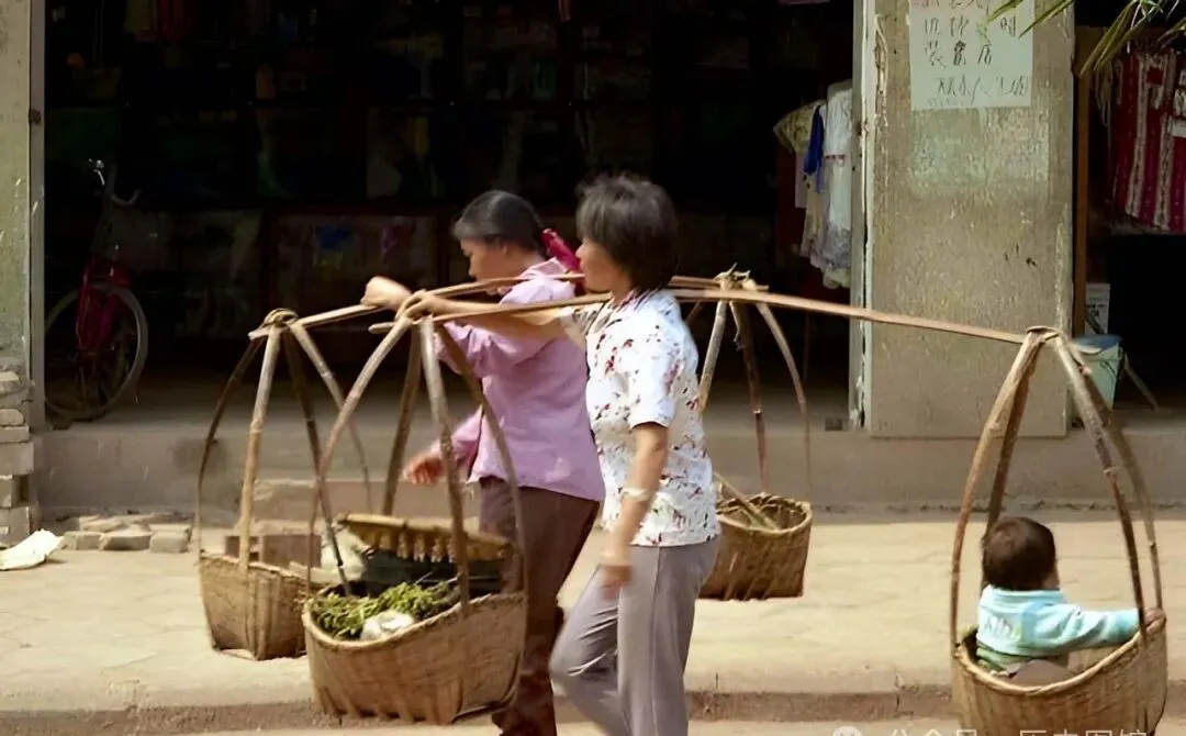 这个就是竹篓挑担,扁担横在肩上,一头是青菜一头直接把娃娃安进筐里,装菜装生活全靠它,赶集时常看到这样的画面,母亲边走边喊后面的孩子别出来,嘴上数着菜价,脚步不停,这种竹篓搭配伞形扁担,版纳街头巷尾随处是,腰上一担柴,叫卖声像歌一样飘了整条街。