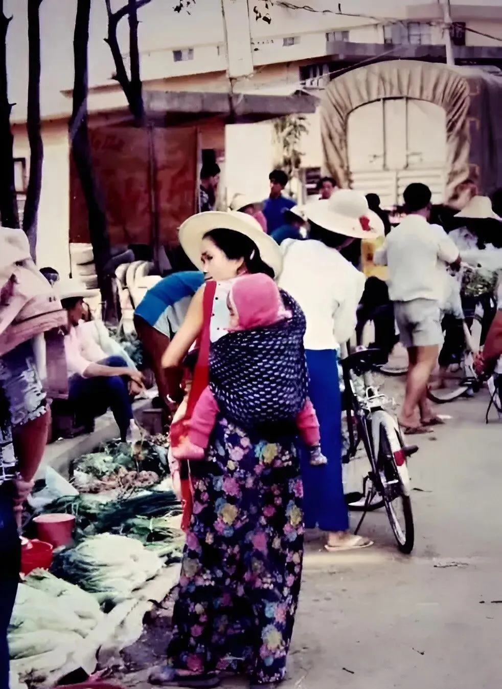 图里背着娃的小贩,身上花裙一身自带西双版纳味儿,老式自行车靠在一边,身后全是堆起的青菜和吆喝声,小时候跟奶奶去赶过早市,她会把我绑在背上,一手挑菜一手还不忘分给旁边小贩几句家常,天刚亮,谁家先到谁摊头才够好,市场上人挤人,都图个早起新鲜。