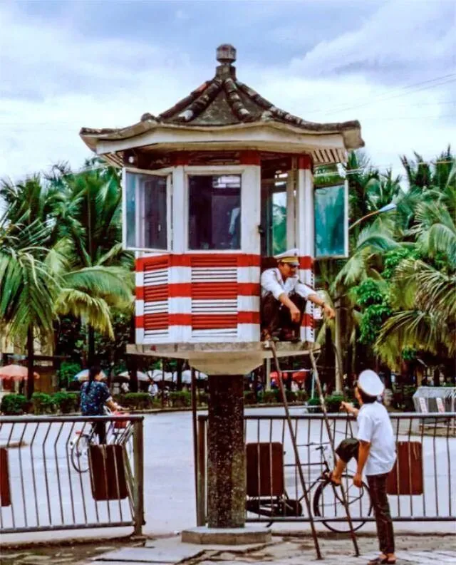 这个造型怪的新式红白条警亭,高高架在柱子顶上,上下全靠梯子,警察爬上去就能把路口一览无余,小时候觉得警亭像个侦探窝,谁在旁边晃一圈都得被记住,遇到下雨天,警亭更是显眼,伞和雨衣全绕着栏杆挂了一圈,时代变了,老警亭被换成信号灯,街景一点点被新鲜东西冲淡。