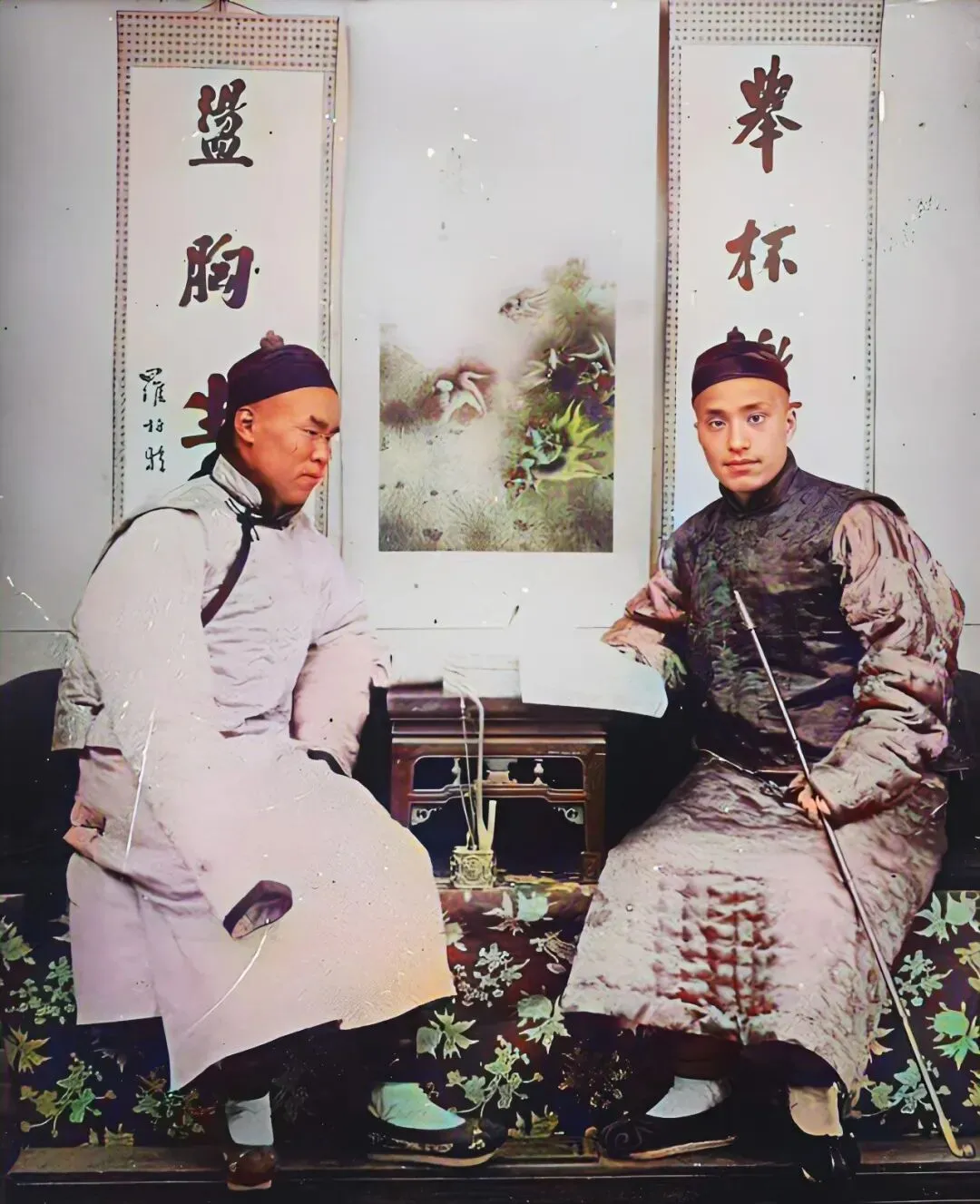 左边的男子脸沉静,手里捏着根长长的旱烟杆,烟锅底早已熏成漆色,每次点火都得小心别掉炉灰,右边那位靠在椅背,指尖还搭着一只小巧的水烟壶,水烟壶是铜的,壶嘴儿细,小时候我见我二舅还有,抽烟讲究些,水有点烧着,烟气一过,屋里立刻有一股淡淡的甜香。