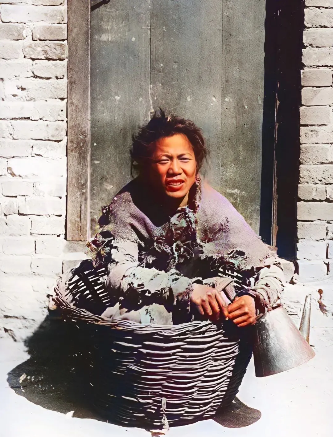 爸说,这样的人八成是北平城里的乞丐,那时候靠着箩筐当窝,水壶拎在手,就是全家当了,大夏天坐在砖墙下,偶尔有路过的好心人丢点吃的,小伙子就能乐呵一个下午,那个年代人家里日子都苦,听老人讲过,哪怕再难,脸上的笑从不肯减一点,照相机突然捉了这一刻,把以前的日子都收进去了。