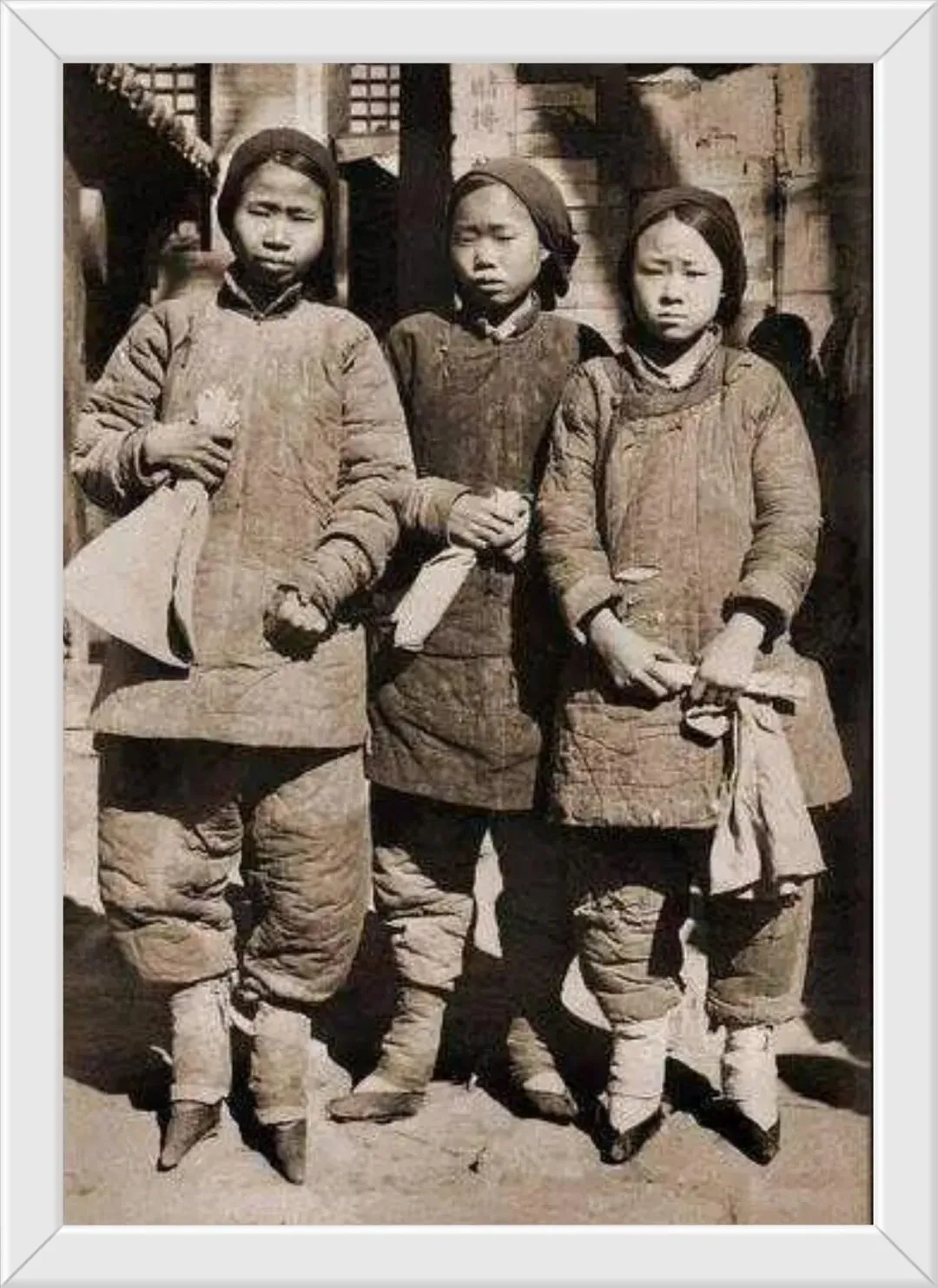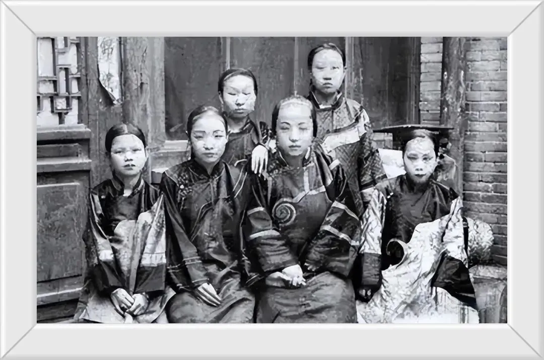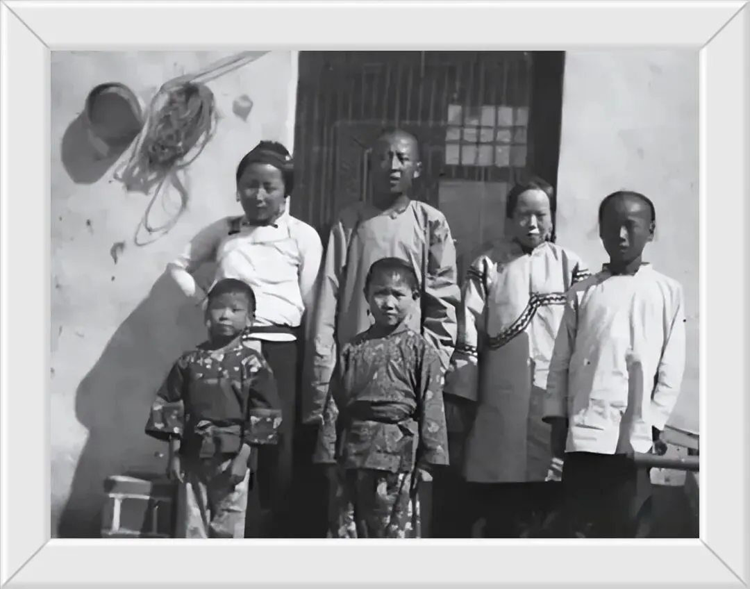 8. 清代一户人家的全家福,妻妾儿女同框,最让人揪心的是,两名未满十岁的幼女,早已被缠足,小脚彻底定型。