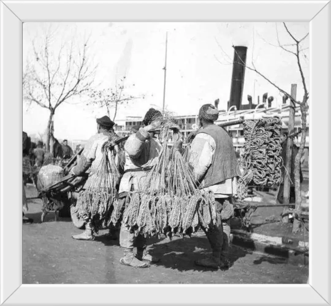 3.婆媳俩都裹着小脚,慢慢推着石碾忙活,看模样应该是在家磨粮食,一步一挪,看着就让人觉得辛苦。4.街头总能碰到好几个编草鞋、卖草鞋的人。不是大家都爱做这门生意,实在是那时候条件有限,普通百姓也只能穿得起草鞋罢了。