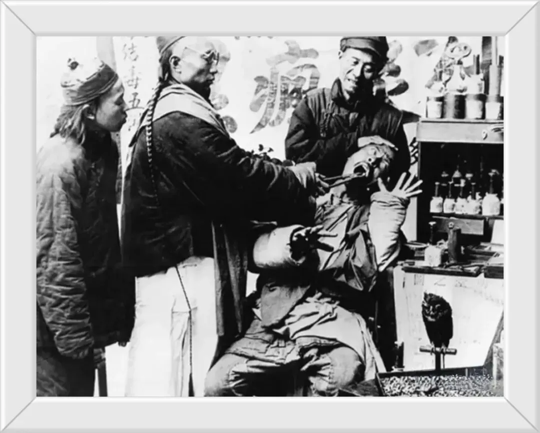 11. 早年没有麻醉药剂,牙医为男子拔牙时,患者因剧痛面目扭曲,满是煎熬。