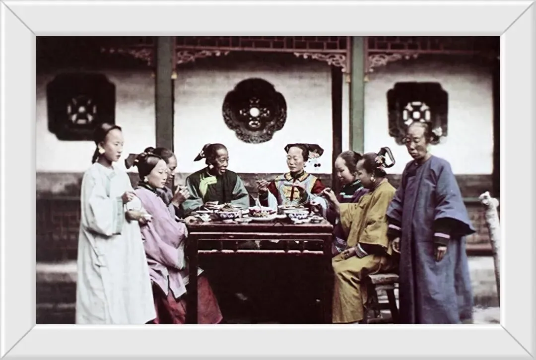 12. 旧时官宦府邸的用餐场景,女眷围坐就餐,家中女仆垂手立在一旁,随时伺候。