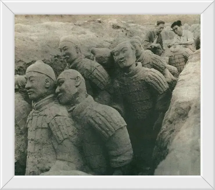 16. 早年拍摄的秦兵马俑坑,部分陶俑相互倚靠,姿态格外别致生动。