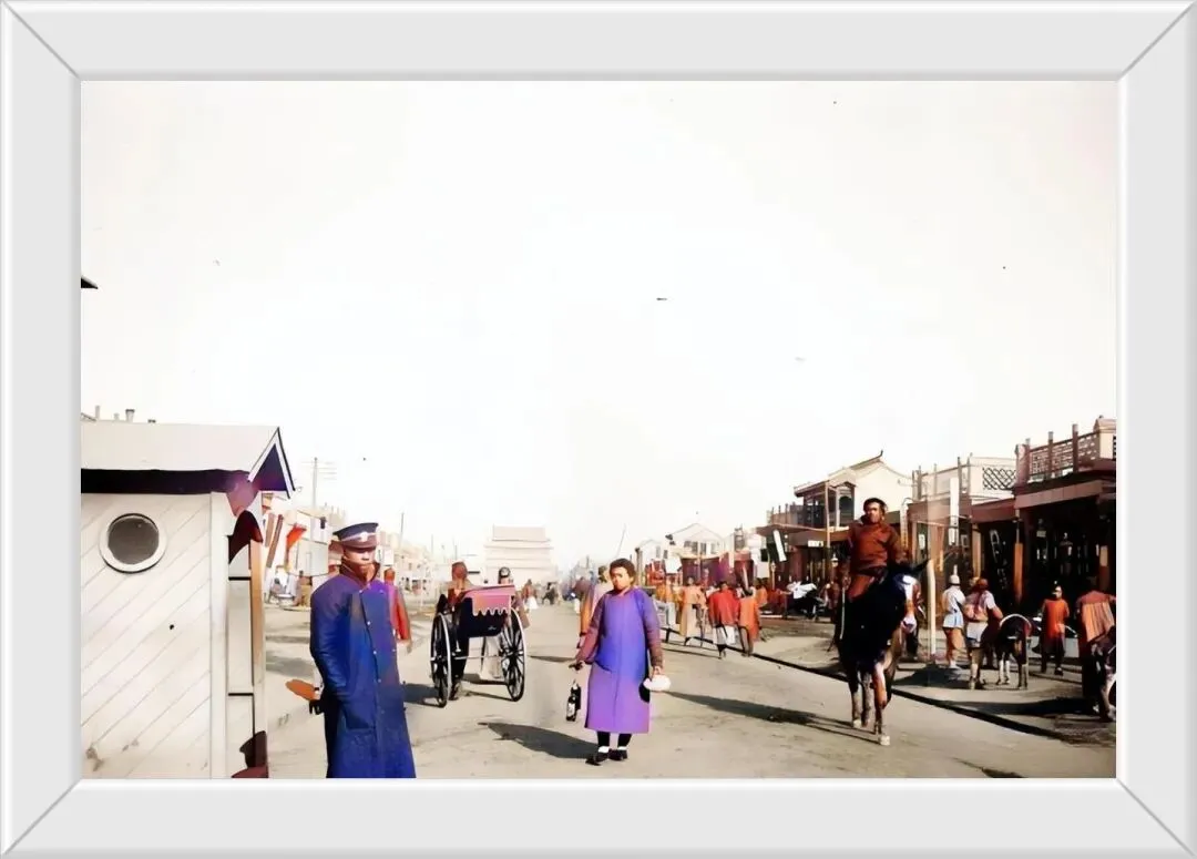 19. 晚清时期的前门大街,骑马的行人与拉客的黄包车,交织出旧时市井百态。