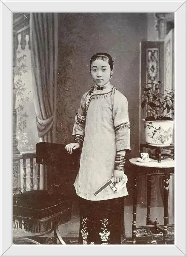 26. 一位晚清女子的个人照片,裹着小脚,留着当时最时髦的满天星刘海,一看就是大户人家出身,生的好。