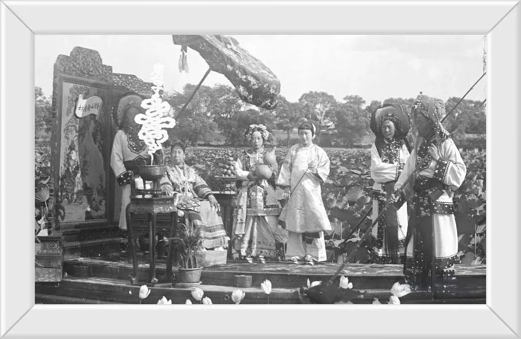28. 这张照片是慈禧太后扮观音的经典影像,出自慈禧御用摄影师勋龄之手,船中宝座之上的正是慈禧太后,她自称为“老佛爷”。