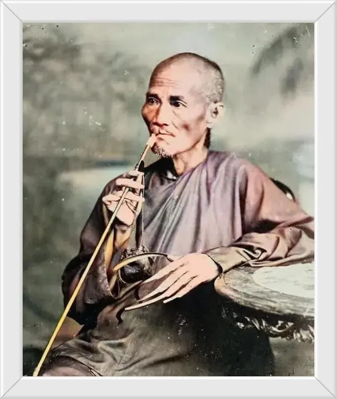 29. 一位唇部有残缺的男子,他正悠然地吸食着旱烟,左手修长的手指搭在桌沿,留着长长的指甲,这个就是长期不从事体力劳动的人。