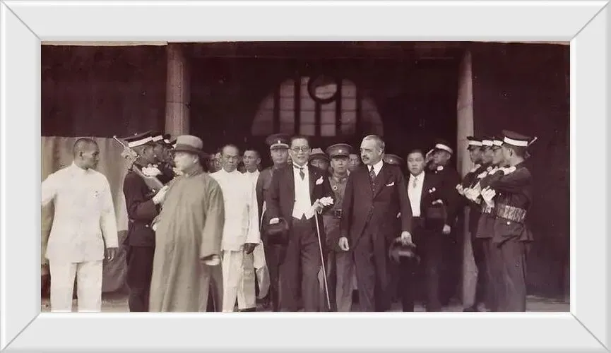 30. 上世纪30年代,国民政府的官员们,正式迎接来访的外国宾客。长衫与西服,中西合璧的典型。