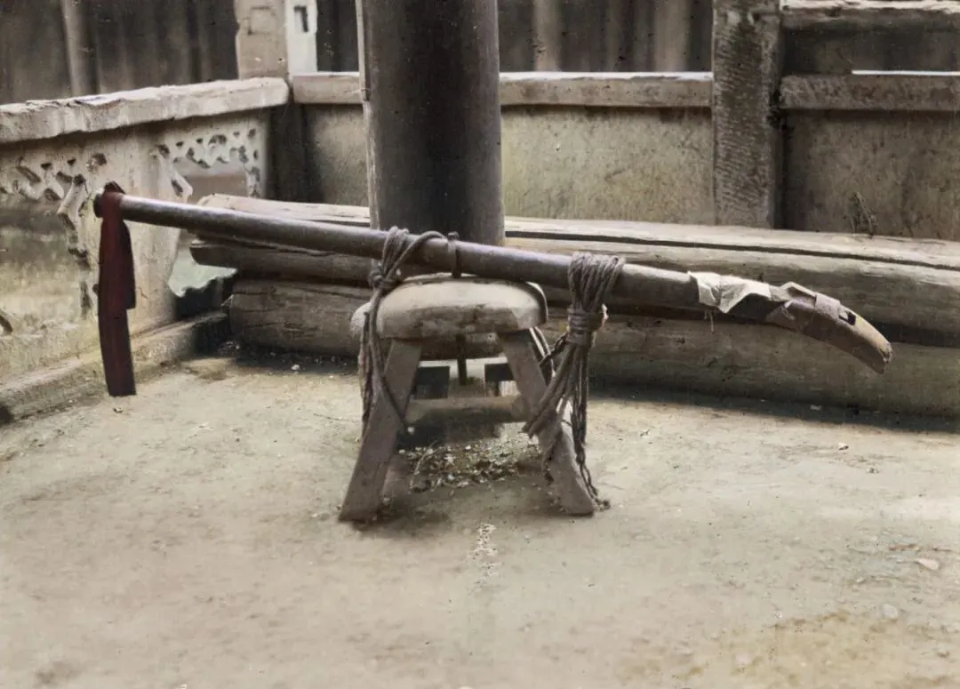 图中那根绳子绑着的家伙叫老式火枪,生铁打的管子粗得像根手臂,一头还系着一块红布,掂一掂指定沉,摆在板凳上不挪窝,看起来不起眼,其实这东西来头可不少,城楼守兵的门神。