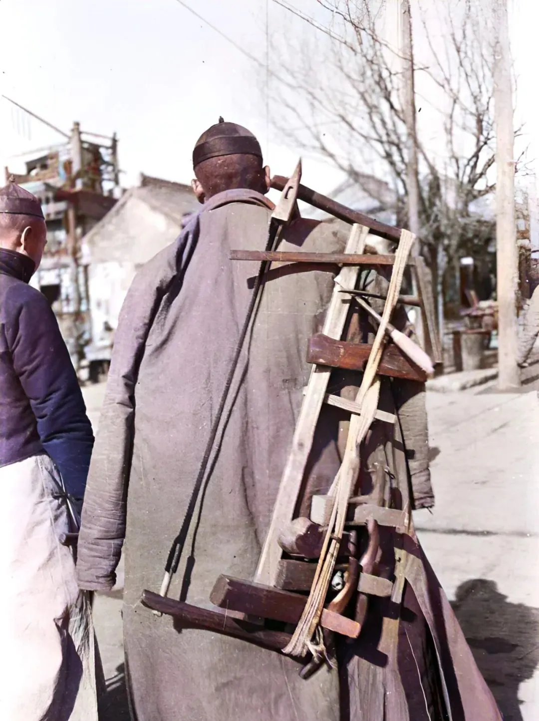 这张里头那背影可有意思,身上背的全是木匠家伙什,长短不一,从肩膀上一路斜下来,密密麻麻十几种,看得人眼晕,最显眼的木锯搁最上头,肩头斧头、手臂上各种刨,一大串粘得像武器架,走路还得小心别钩着。