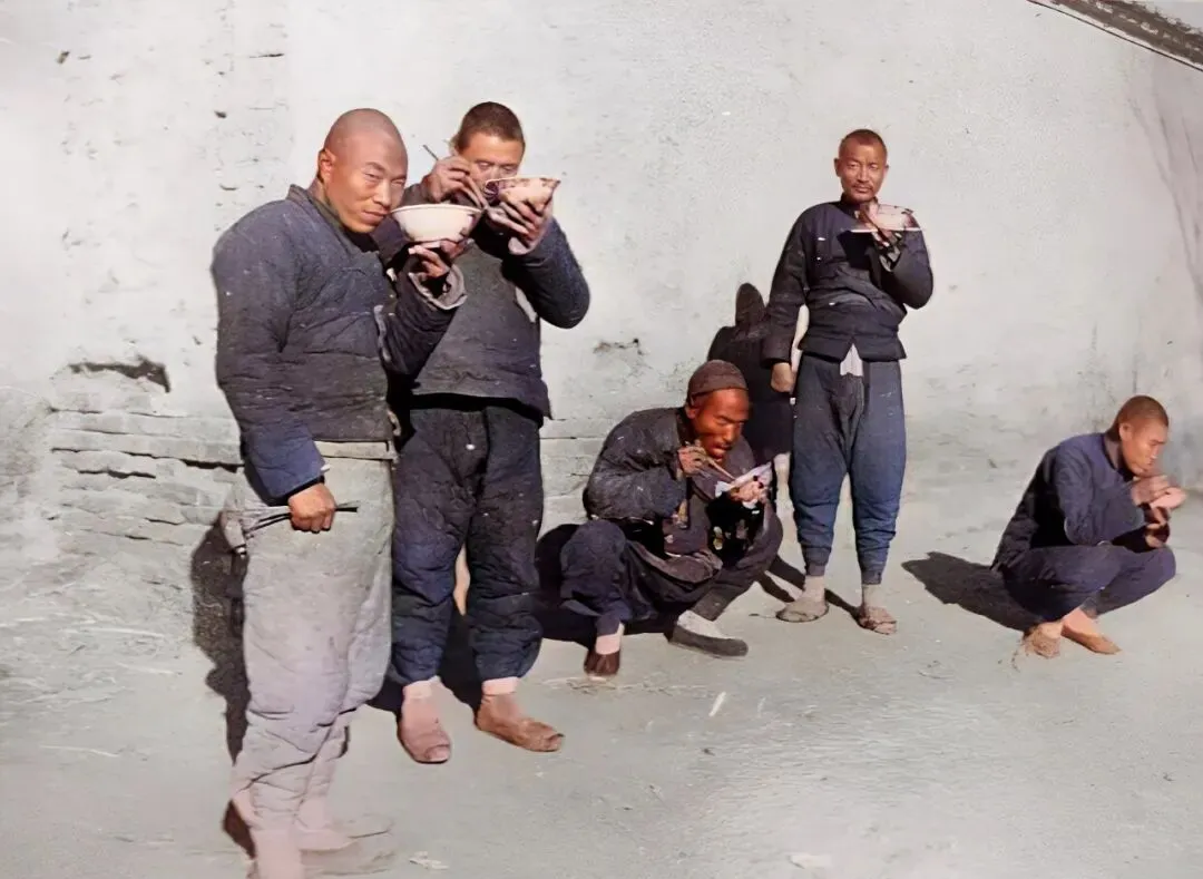 图中这群汉子穿着一水的旧棉衣,褪了色的裤腿麒麟花都磨软了,手里端着粗瓷大碗,筷子一挑一挂,几个人干脆就蹲地上吃,傍墙边找块稍平的地方聚一圈,谁也不讲究桌椅板凳,脚绷着,屁股往下压,那姿势才叫踏实。