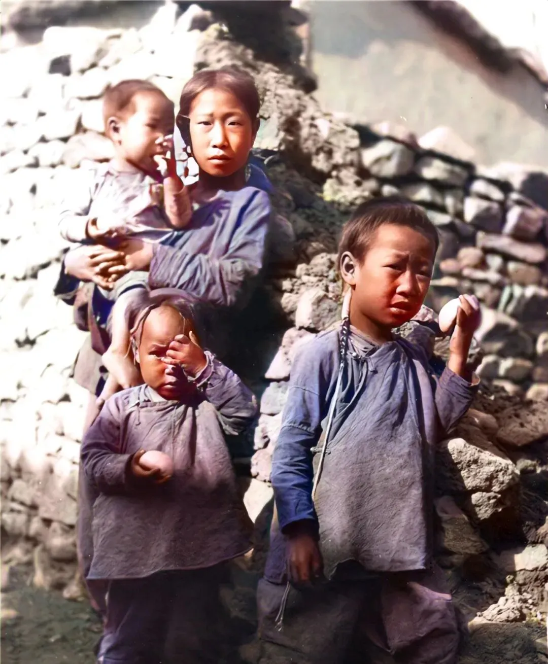 这个场景看着简单,后头却是一肚子的故事,图里的小姑娘十岁出头,怀里抱着弟弟,身边跟着妹妹,哥哥,三个孩子穿着一样的旧衣裳,小手里头攥着馒头,脸上风吹日晒的痕迹一清二楚。