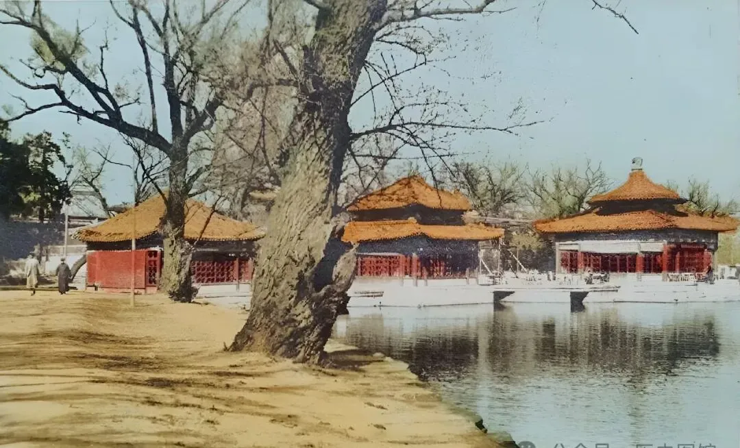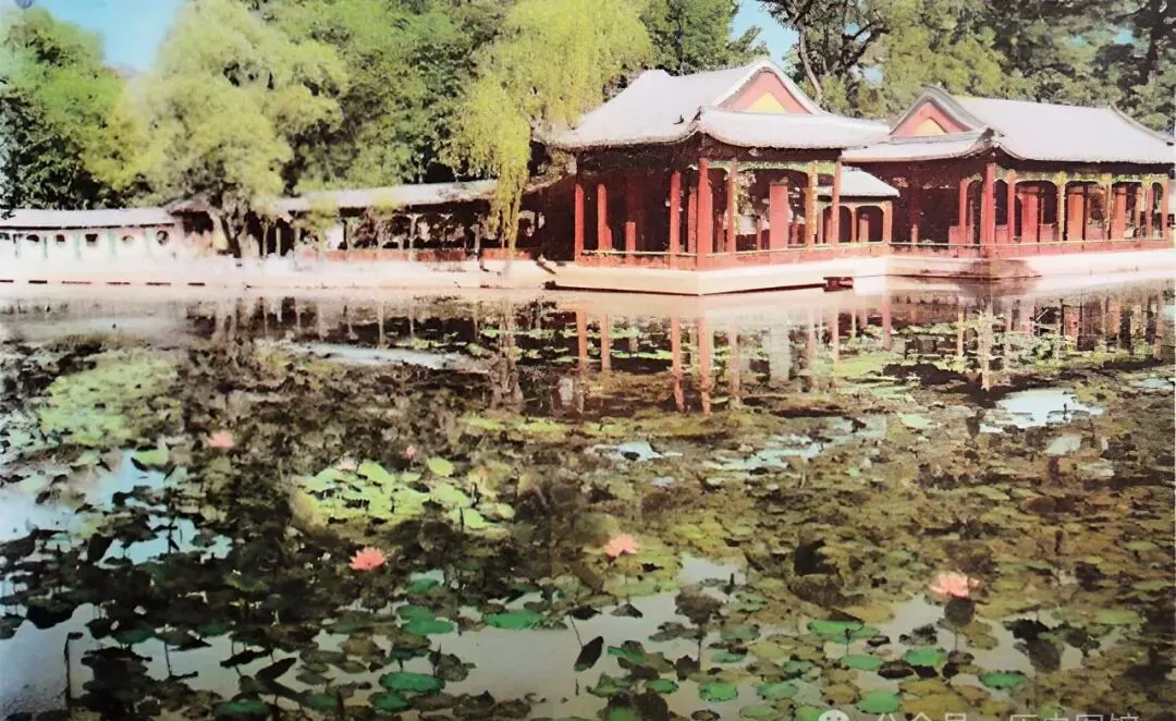 这座亭子叫五龙亭,明万历年间的老物件,五个亭子掘进湖水里,廊桥把它们串成一体,远远看着像五个小岛并肩靠着,中间还有个人撑着船缓缓划过,那感觉和现在北海公园的热闹全然不同。