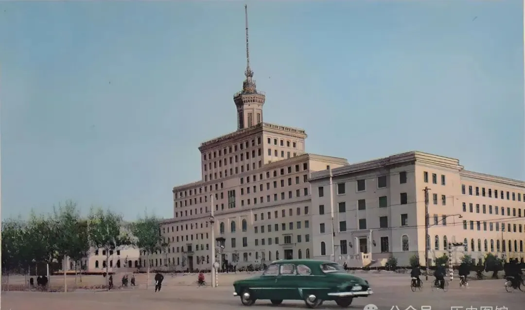 照片里这座楼叫广播大厦,灰白色大楼配个高塔,周围只有零零散散几辆车,气场特别大,1958年刚建好的时候,爷爷骑车带着我到门口,指着楼顶的天线说北京的好声音就从这里播出去,我们那时候没手机电视,这楼就是新鲜劲头。