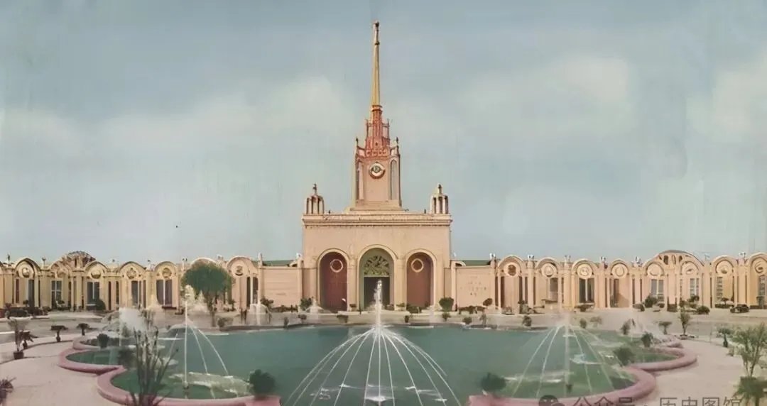 说到展览馆,那会儿叫苏联展览馆,欧式尖塔配宽敞院子,前头喷水池一响,小孩总爱围着跑圈,爸说每年有大展会,热闹得很,广场咕噜咕噜冒水声,是童年闹市的记忆。