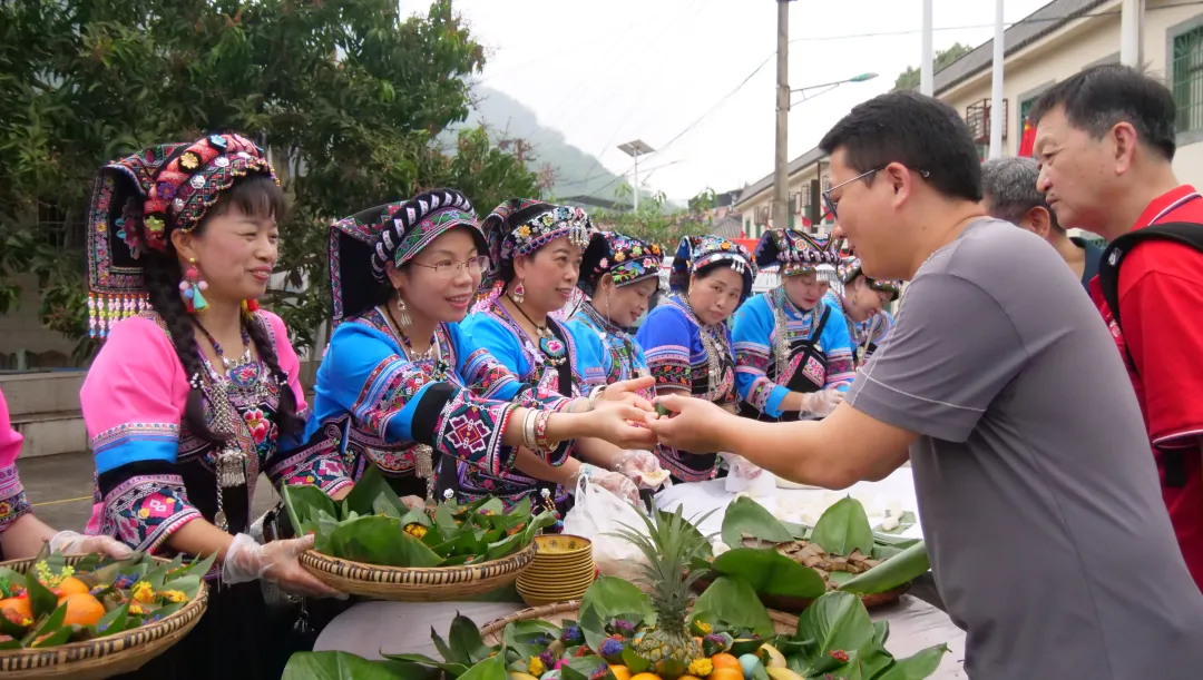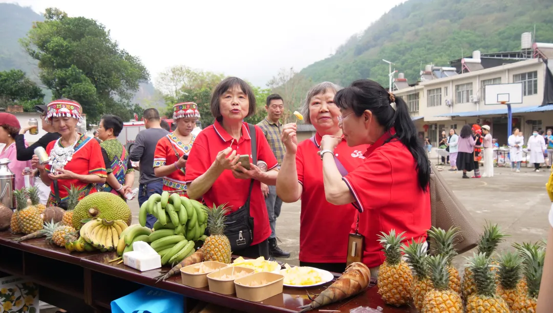 文化馆外,乡亲们热情招呼着老知青。一盘盘彩色花米饭摆上桌,不少知青还亲自上阵体验舂粑粑。舂好的粑粑用芭蕉叶包好递到大家手中,大家相继品尝了河口的菠萝、青柚和金花皇茶等,笑声不断。知青罗渝说道:“我们几位同学商量着买几件特产寄到重庆的学校,作为伴手礼请同学们也品尝一下。”