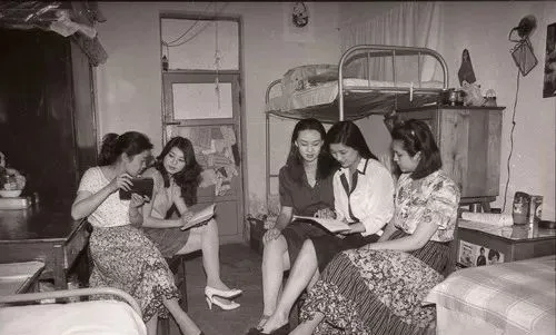女职工宿舍,从穿着看,这些年轻的女孩子像是做文艺工作的。