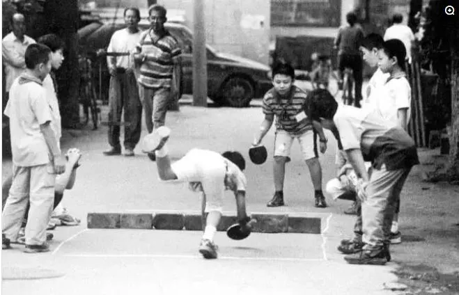 照片上为一群小学生放学后打乒乓球,乒乓球运动开展的条件不高,没有球桌,在水泥地面上或者拼几张桌子都能打。