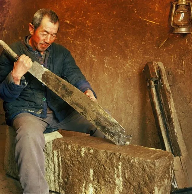 一个正在磨刀的老大爷。这种大刀,应该是轧草用的。