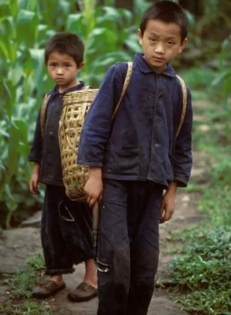 两兄弟背着竹筐到田里帮忙干农活,以前农村的小孩很小就要开始帮家里干活。