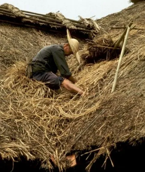 一个农民正在修屋顶,这种草屋经常要修,不然下雨了就很容易会漏水。