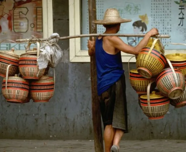 一个农民担着一担自己编织的竹篮,走街串巷地去贩卖。