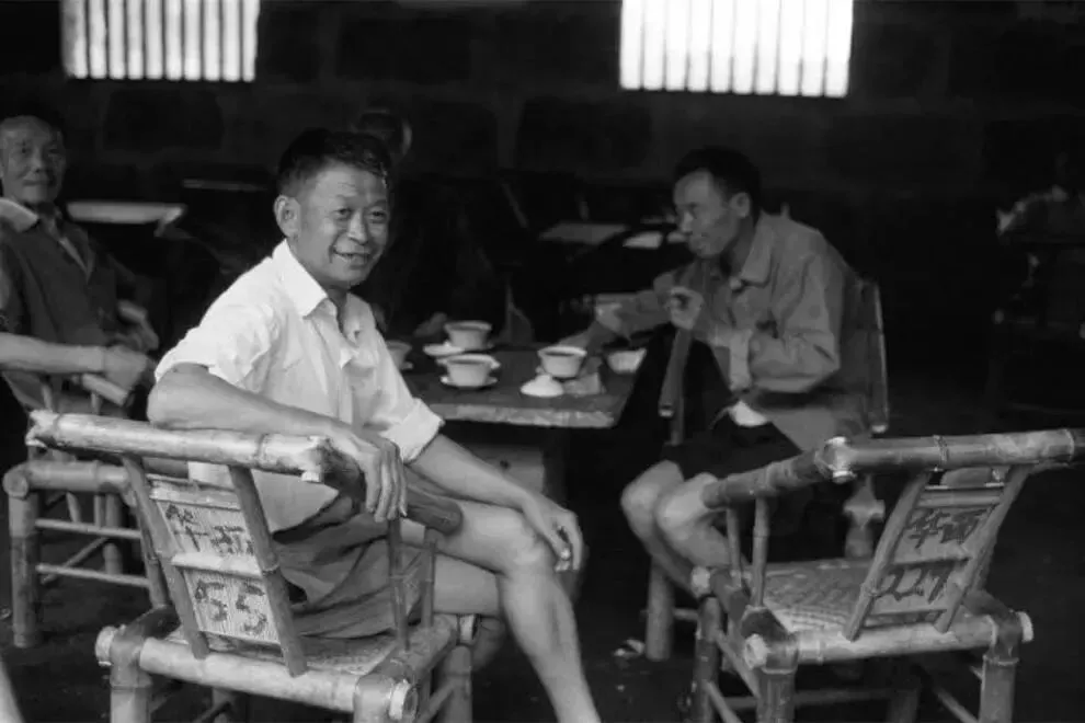 80年代,坐在一起喝茶、聊天的人,那时候生活节奏没有现在这么快。竹椅的后面写着“华西”二字。照片应该是在四川拍摄的。