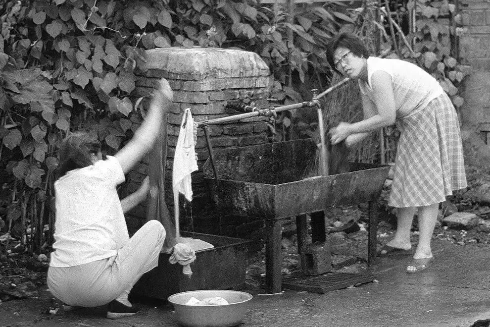胡同里,在洗衣服的家庭主妇们。那时候,大家共有几个水龙头。