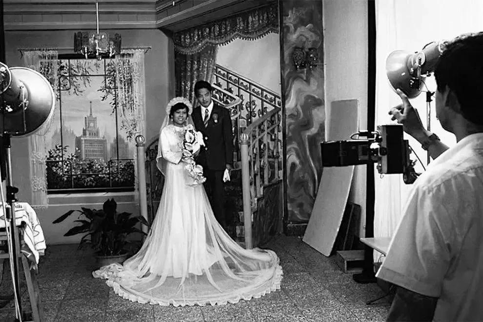 在拍婚纱照的新婚夫妇;那时候基本上都只这样简单拍一张,不像现在一拍就是拍N多张。