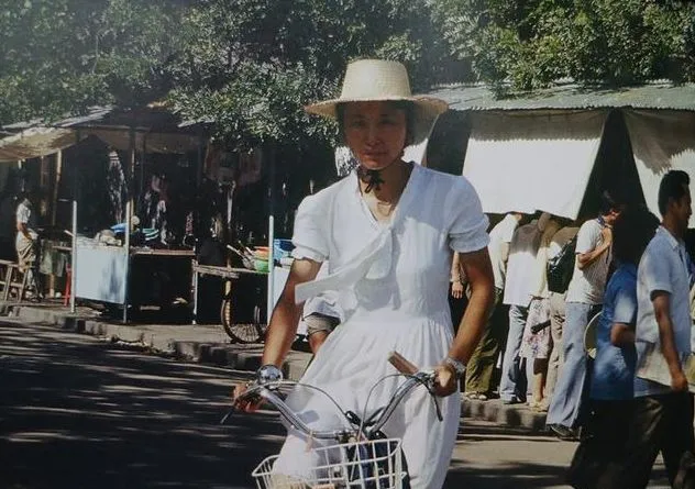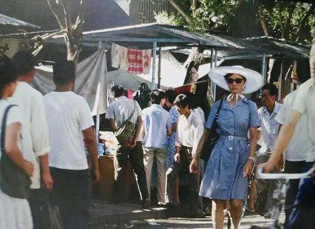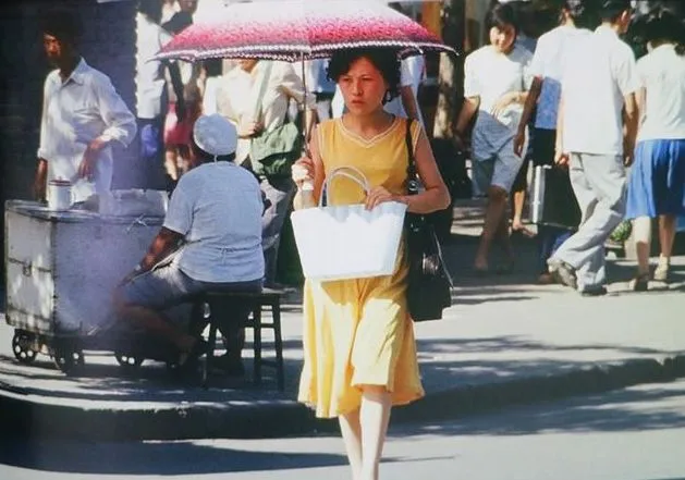 1981年,北京街头的一名时尚中年女子,遮阳扇放在现在也不过时,黄色的连衣裙,白色的篮子,画风完全与周围不一样。