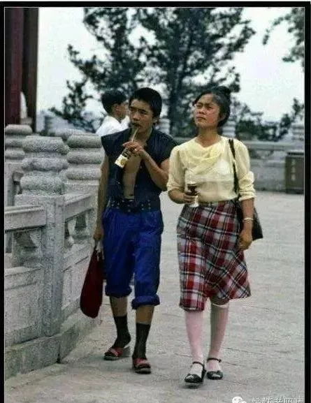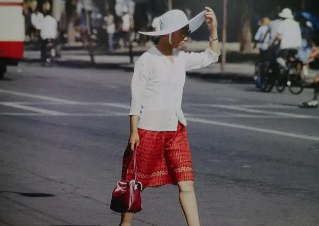 这名女子的打扮在80年代一定是最时尚的,白色的上衣搭配红色的裙子,还有一顶白色的帽子,一点也不落俗套,回头率肯定百分之百。