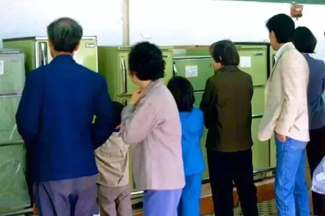 人们正在看电冰箱,那时候能买得起的家庭还很少。