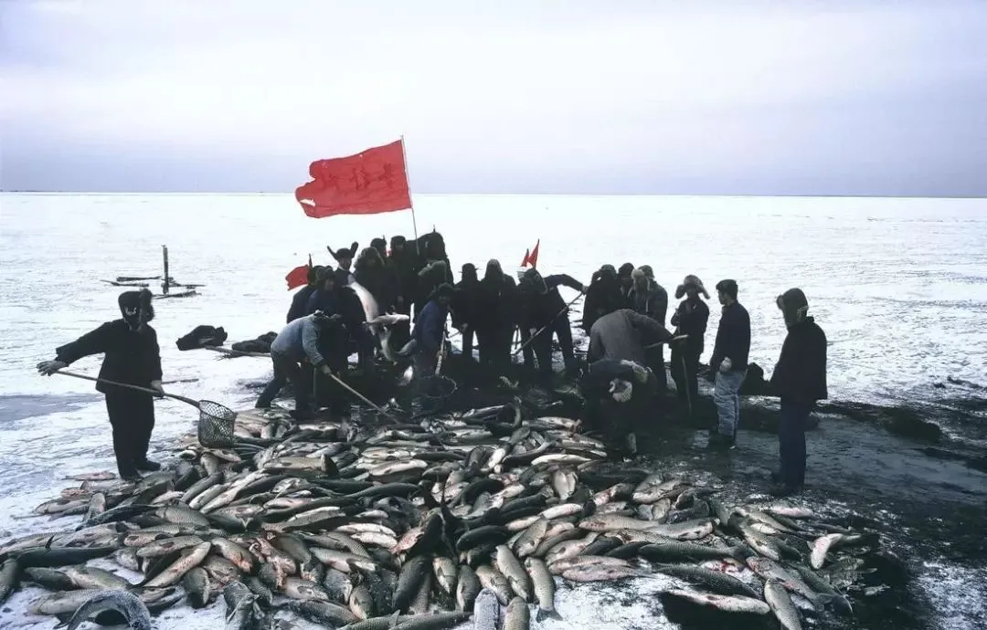 1981年:寒冷的冬天,一群人在海里捕鱼,满地的鱼,收获不少。