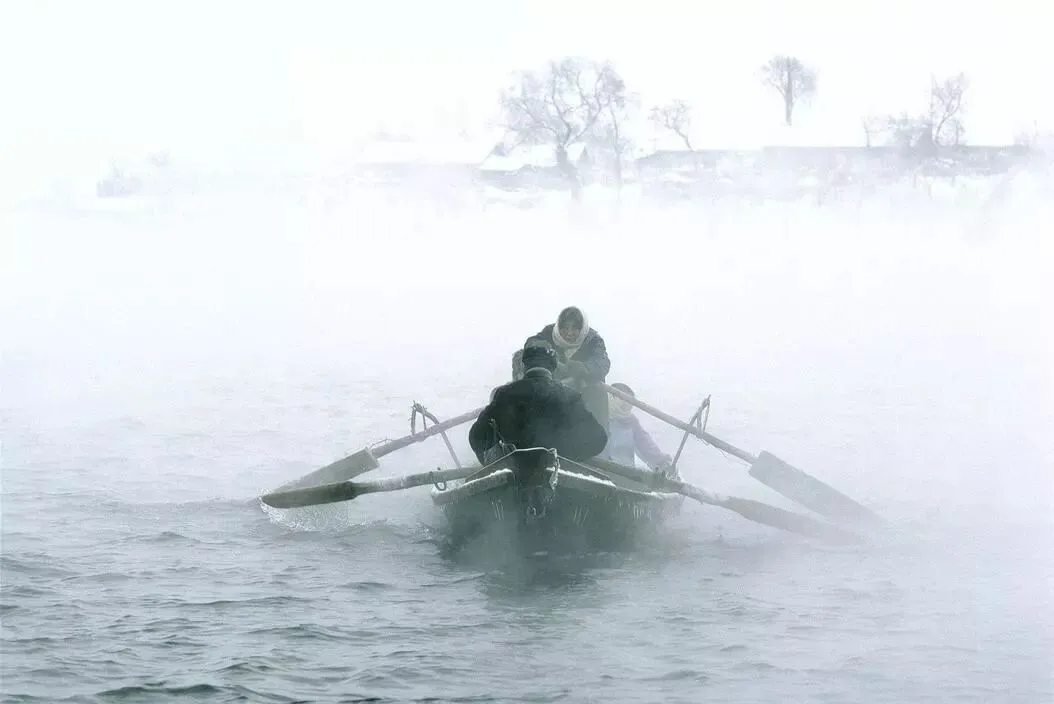 1981年:冬天的松花江上,一家三口划着小船。
