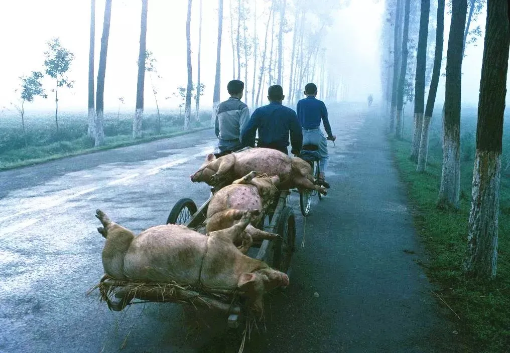 1981年:农民用平板车拉着三头猪,准备到集市上去卖。
