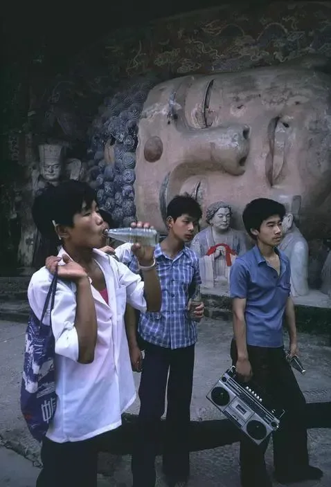 1981年:某旅游景点里的三个年轻人,其中一个男子手提录音机,那时候很多年轻人喜欢拿着录音机到街上耍酷,引人注目。