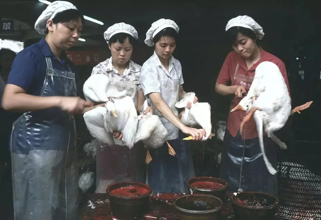 1981年:一家卖鸭子的店里,四个中年妇女在杀鸭放血,动作非常熟练,现在的年轻女孩没人敢做这事了。