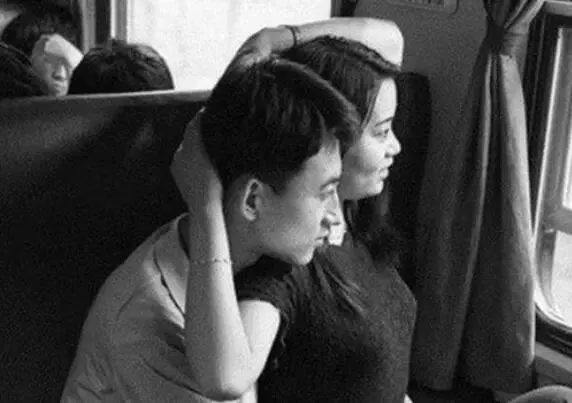 列车上的一对情侣,这对情侣不知坐着火车去哪。二人的动作十分亲密,女生揽着男生的脖子,这画面和如今的很多情侣恋爱一样,可见那个时候人们的恋爱思想已经很开放了。