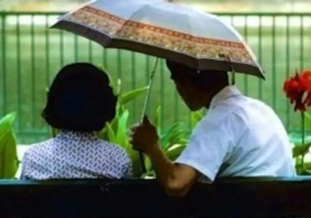 照片上一对情侣打着伞,坐在长条椅子上,在雨中谈情说爱,别有一番韵味啊,画面看着好唯美。