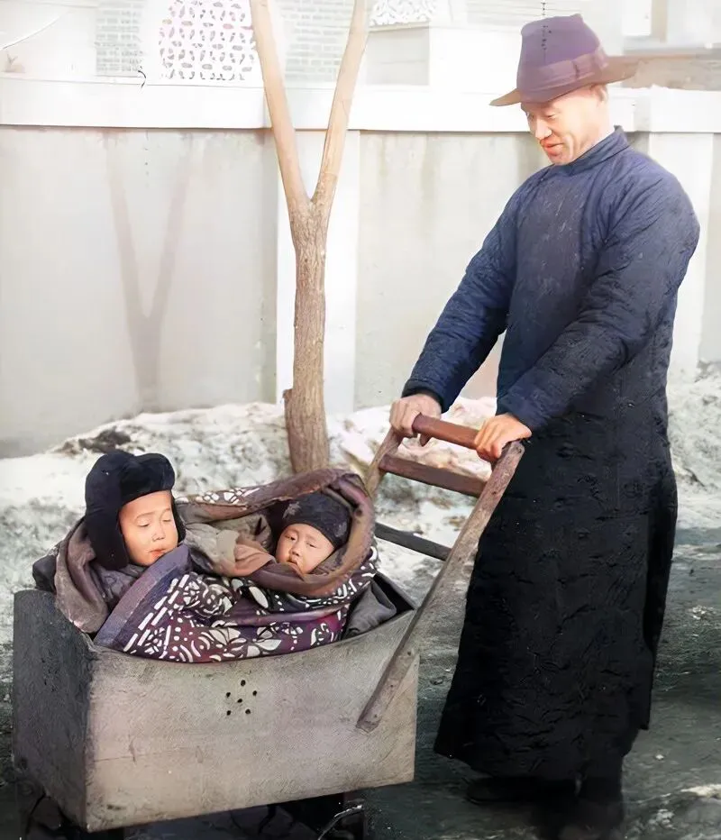 老照片里的这架木头婴儿车,样子憨厚,全用实心木板糙制,外头温度还低,地上的雪冰渣没化,父亲戴着毡帽,手一推,俩小孩紧挨着,厚棉被裹得像肉棕,小家伙眼睛半睁不睁,脸上挂着点刚睡醒的迷糊劲儿,这种婴儿大车搁现在想见都难了,以前条件有限却有自己的温情。