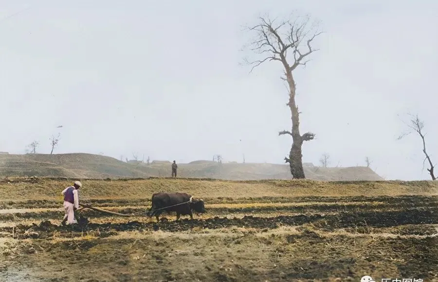 春耕正忙的田头,人和牛一块拉扯,二八岁的孩子跟在屁股后头学,深一脚浅一脚把垄沟扒拉得直溜溜,老农手里攥着犁头吆喝一句,牛憨憨地慢慢走,远远地见还有人站着抽烟袋,田里没有拖拉机,全靠牲口和膀子劲拉活儿,一趟趟累是累,庄稼能发芽才算心安。