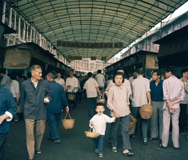 1982年的上海菜场,真不是后来超市那种亮堂整齐。棚子下面人来人往,地面看着就知道下雨天不会太干净,可每个人手里拎着的,几乎都是竹篮、藤篮、网兜。这一点我是真有点感触。现在总说环保,那时候的人可不是喊口号,是真拿着篮子去买菜,买豆浆自带壶,打酱油料酒自带瓶。