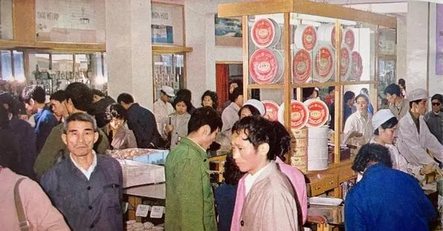 食品商店那张也特别耐看。柜台后面站着营业员,玻璃柜里放着点心和罐头,墙上灯光不算亮,可店里挤得满满当当。人们的衣服颜色普遍偏灰、蓝、米色,但你仔细看,又不是完全单调,围巾、翻领、呢子外套,已经有了讲究。更难得的是那种排队的耐心。不吵不抢,轮到谁就是谁,买个东西也有秩序感。