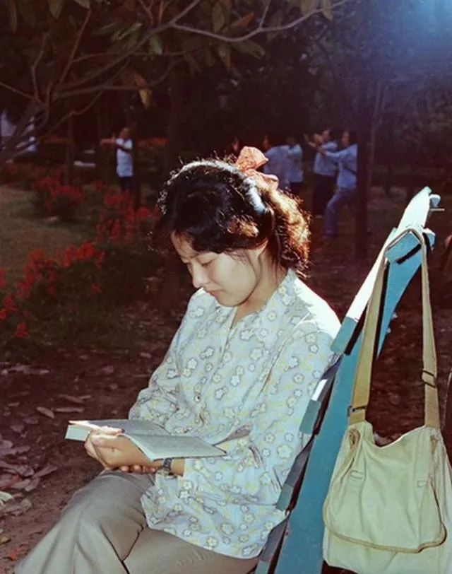 这组照片里,我最喜欢看人的状态。比如那个坐在公园椅子上看书的姑娘,碎花上衣,头发轻轻扎着,旁边挂一只布包,背景里还有人在活动。她没有刻意摆拍,就是低着头在看书。你会突然意识到,原来1982年的上海青年,已经这么自然、这么文气了。