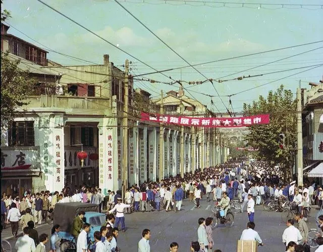 最热闹的是街口大商场一带,横幅拉着,人流像潮水一样往前走。那不是今天逛街式的闲散,而像是大家都知道哪里有新东西、哪里值得去看一眼。上海那时已经很有商业气了,这一点,从街面的人气就看得出来。